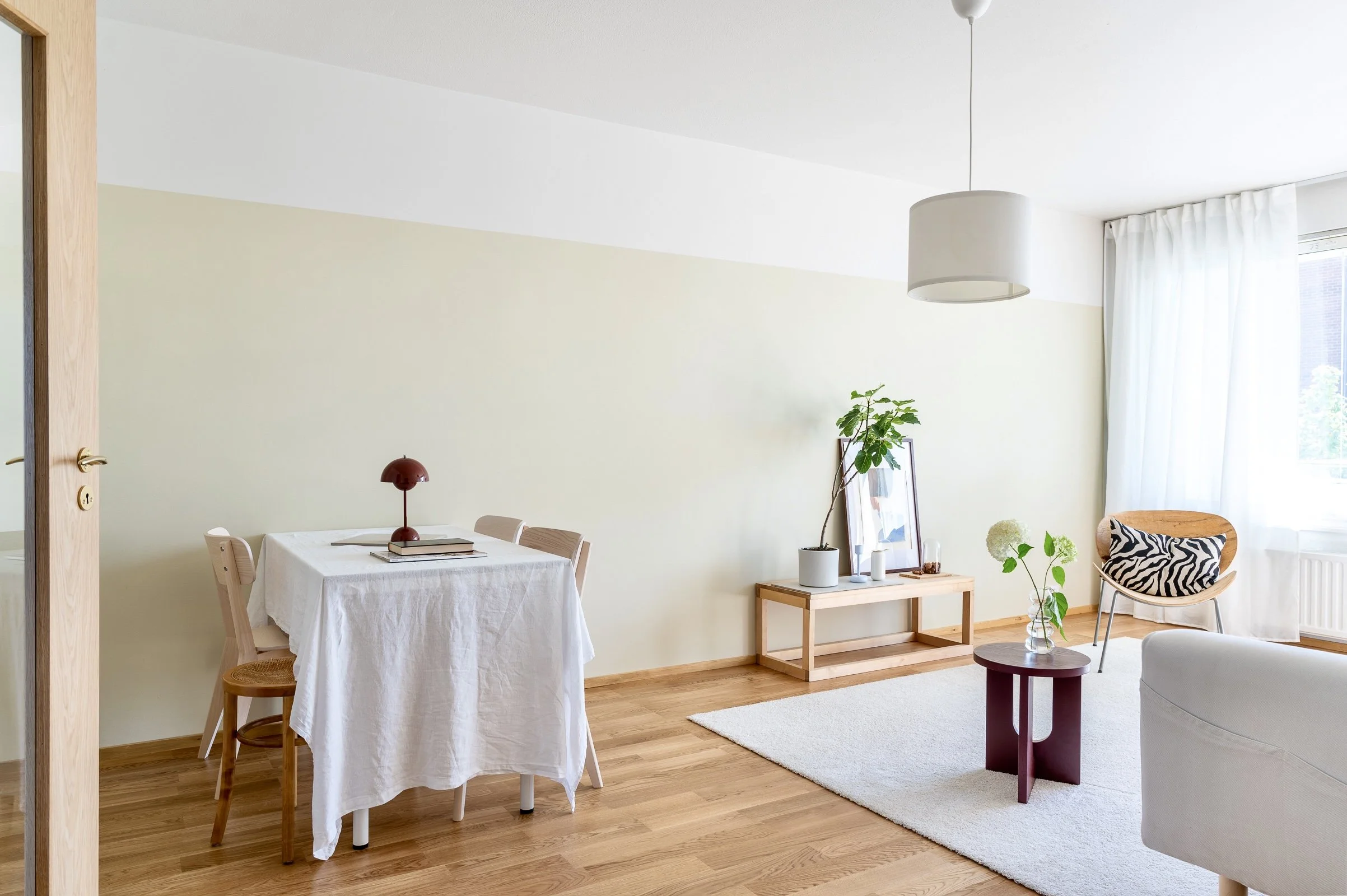 Suunnittelimme seesteisen ilmeen lattiasta kattoon tälle 60-luvun remonttikohteelle. Tampereen keskustassa sijaitsevassa kaksiossa säästettiin alkuperäiset tammiviiluiset väliovet, jotka huokuvat 60-luvun fiilistä. Kodin värimaailma muotoutui lämpimästä valkoisesta ja terrakotasta, jota löytyy myös rakennuksen sisäänkäynniltä. Yhtenäinen tunnelma jatkuu rappukäytävän läpi uudistettuun kotiin saakka. Rauhallista ilmettä elähdyttää olo- ja makuuhuoneen tehostevärit sekä omaperäiset maalauksen rajaukset. Kylpyhuone puolestaan sai yllensä pehmeän spa-tunnelman katon Hali-sävyn ja harkitun valaistusratkaisun myötä. Laadukas kokonaisuus viimeisteltiin kauniilla yksityiskohdilla.